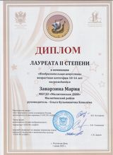 В финал конкурса в номинации "Изобразительное искусство" вышла наша ученица Заварзина Мария ( преподаватель Ковалëва О. К.). 1 июня в г. Ростове-на-Дону в Ростовском областном доме народного творчества прошла церемония награждения победителей. Мария приняла участие в этом мероприятии, где она получила диплом Лауреата II степени и ценный приз.