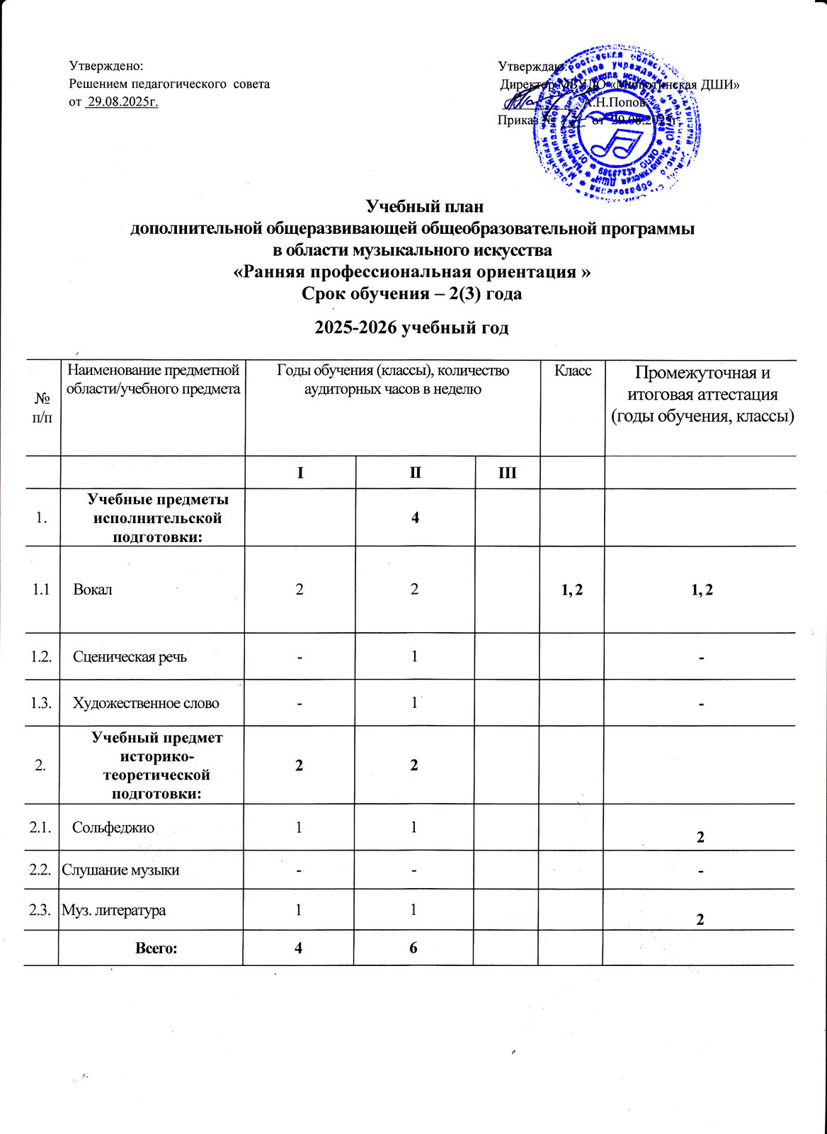 | Образовательная программа, направленность, профиль, шифр и наименование научной специальности | Дополнительная общеразвивающая общеобразовательная программа в области музыкального искусства "Ранняя профессиональная ориентация" 2(3) года обучения |