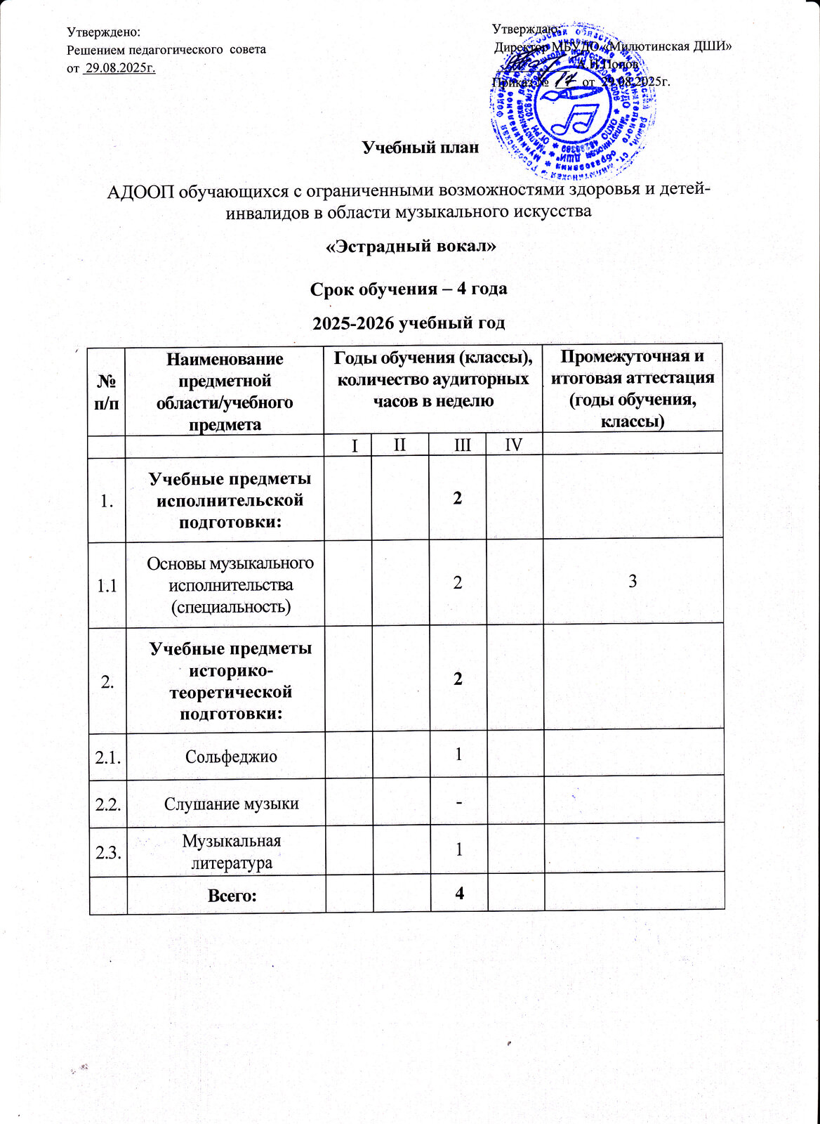 | Образовательная программа, направленность, профиль, шифр и наименование научной специальности | Адаптированная дополнительная общеобразовательная общеразвивающая программа в области музыкального искусства для обучающихся с ограниченными возможностями здоровья и детей-инвалидов Эстрадный вокал "Мы это можем" 4 года обучения |