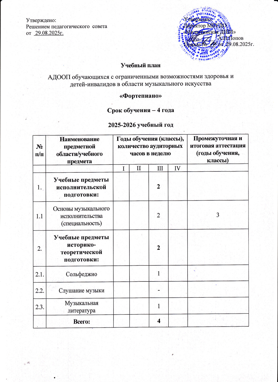| Образовательная программа, направленность, профиль, шифр и наименование научной специальности | Адаптированная дополнительная общеобразовательная общеразвивающая программа в области музыкального искусства для обучающихся с ограниченными возможностями здоровья и детей-инвалидов "Фортепиано" 4 года обучения |