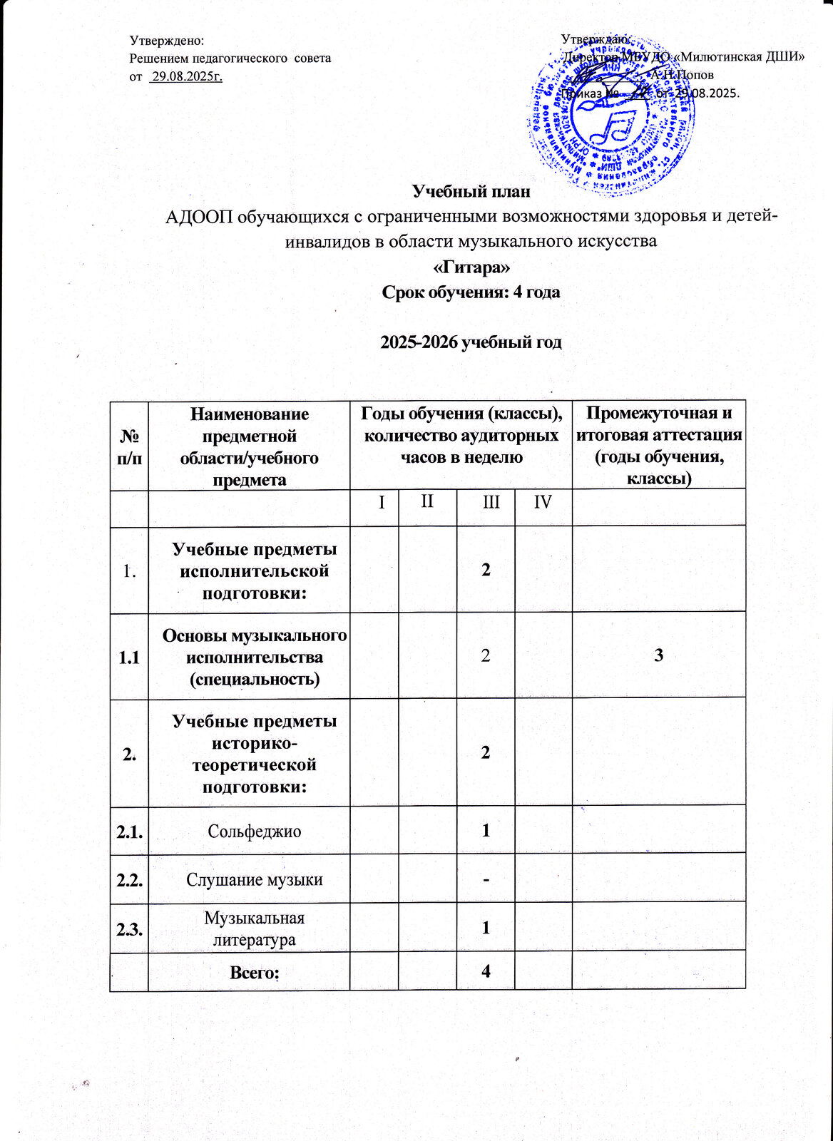 | Образовательная программа, направленность, профиль, шифр и наименование научной специальности | Адаптированная дополнительная общеобразовательная общеразвивающая программа в области музыкального искусства для обучающихся с ограниченными возможностями здоровья и детей-инвалидов "Гитара" 4 года обучения |
